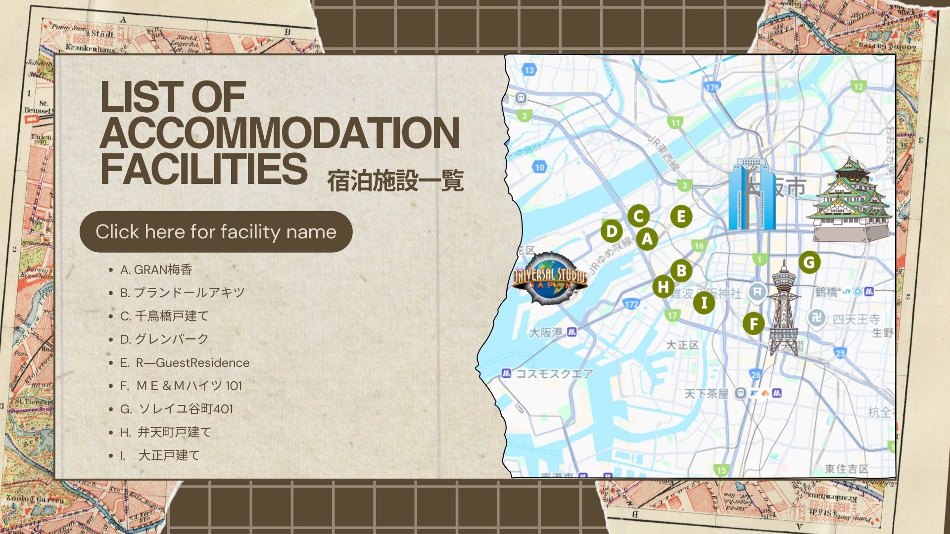 宿泊施設は駅近で、大阪の主要な観光地まですぐの移動可能な場所ばかり